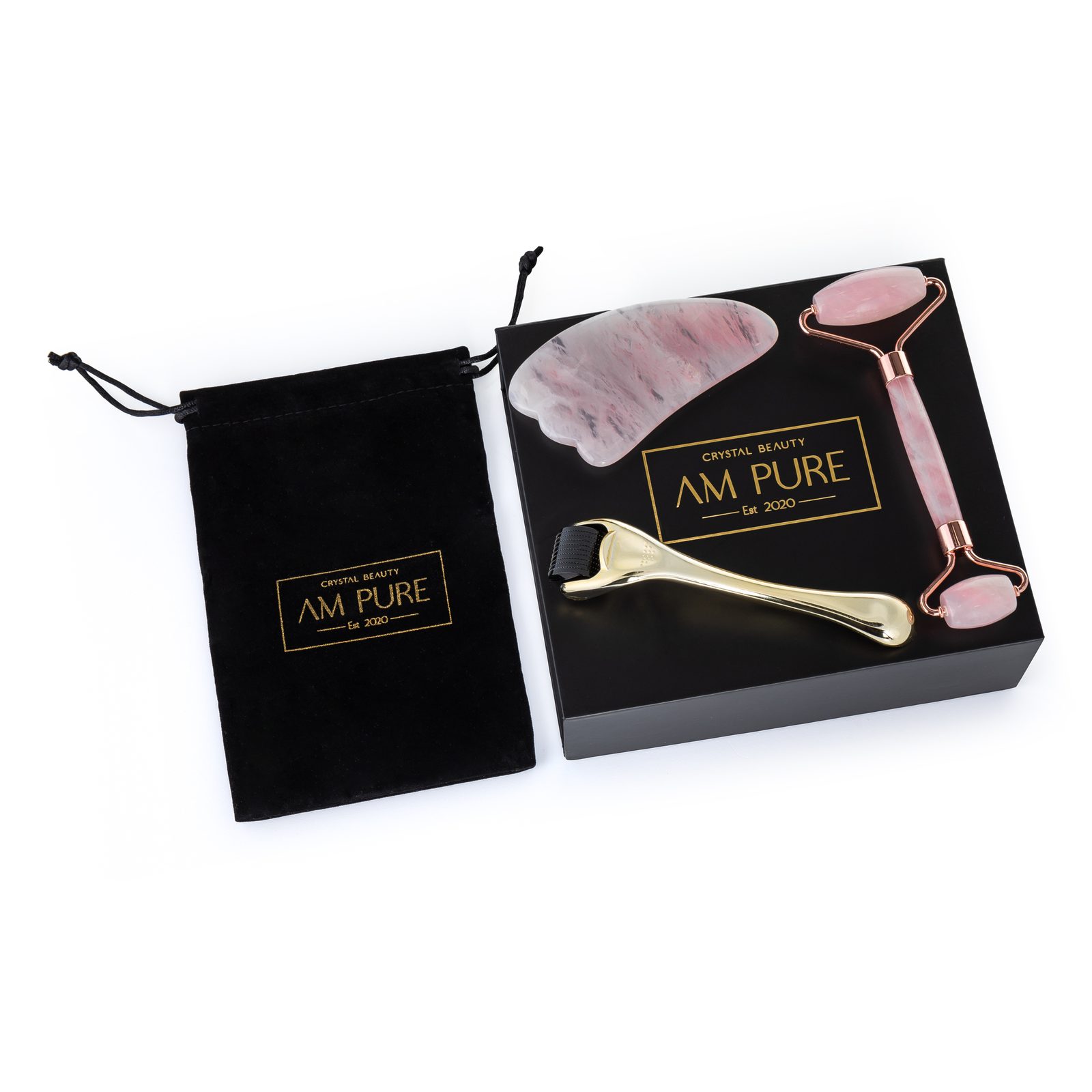 Luxusní masážní sada z růženínu obsahuje masážní váleček na obličej (Jade Roller) a kámen (Gua Sha)…
